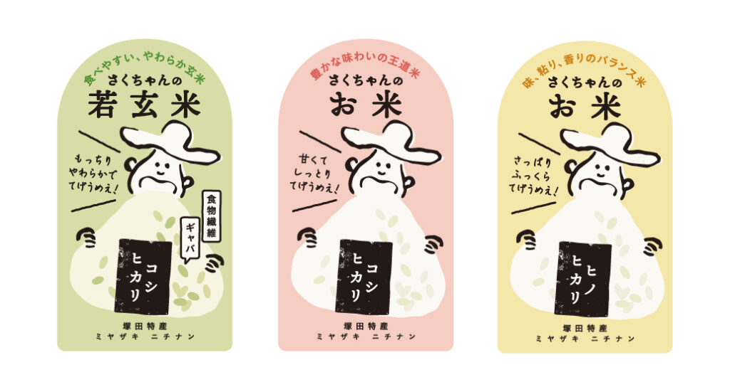 日南市の100年続く農家「さくちゃん農園」の穀物シリーズのパッケージをデザインさせていただきました。